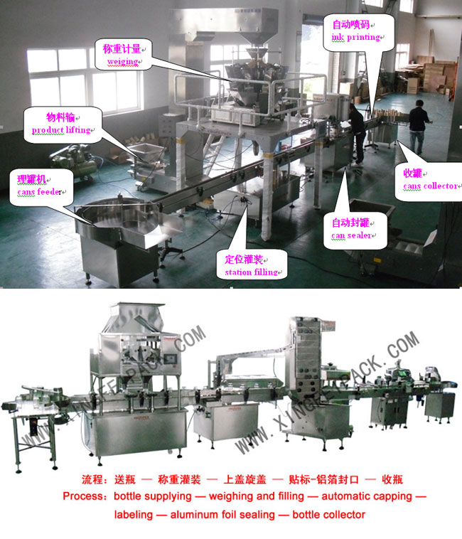 顆粒灌裝生產(chǎn)線用于顆粒物料的瓶裝和罐裝,瓶裝線包含供瓶-稱重灌裝-旋蓋 –貼標-鋁箔封口-收瓶, 罐裝線包含,供瓶-稱重灌裝-封罐-噴碼-收瓶, 具體可按照要求定制。